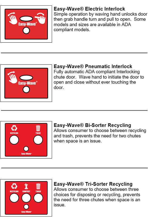 The Easy-Wave® trash chute system is designed to lock out all other intake doors on the trash chute when a door is in use. This is to ensure the safety of users that interact with the chute. The Easy-Wave® system's signature feature allows touchless, one-handed operation that unlocks the chute door when a motion sensor is activated. In electric interlock systems, the user then manually opens the door and disposes of their trash, while in pneumatic interlock systems the door automatically opens, allowing the user to deposit their trash with ease. Each Easy-Wave® door is equipped with a motion sensor and an LED window. In systems with a trash sorter, a set of push-buttons allow the user to select a trash sorting option.